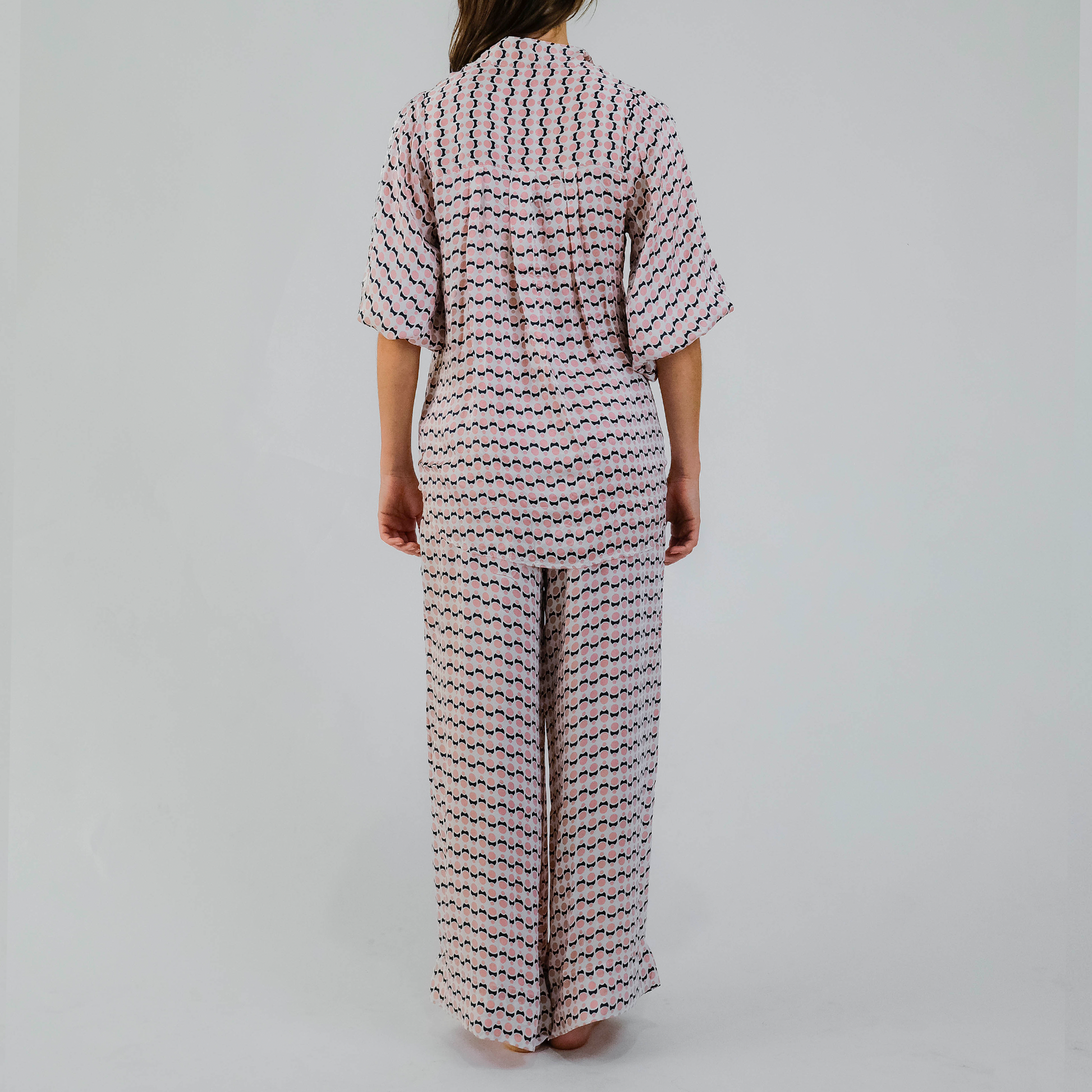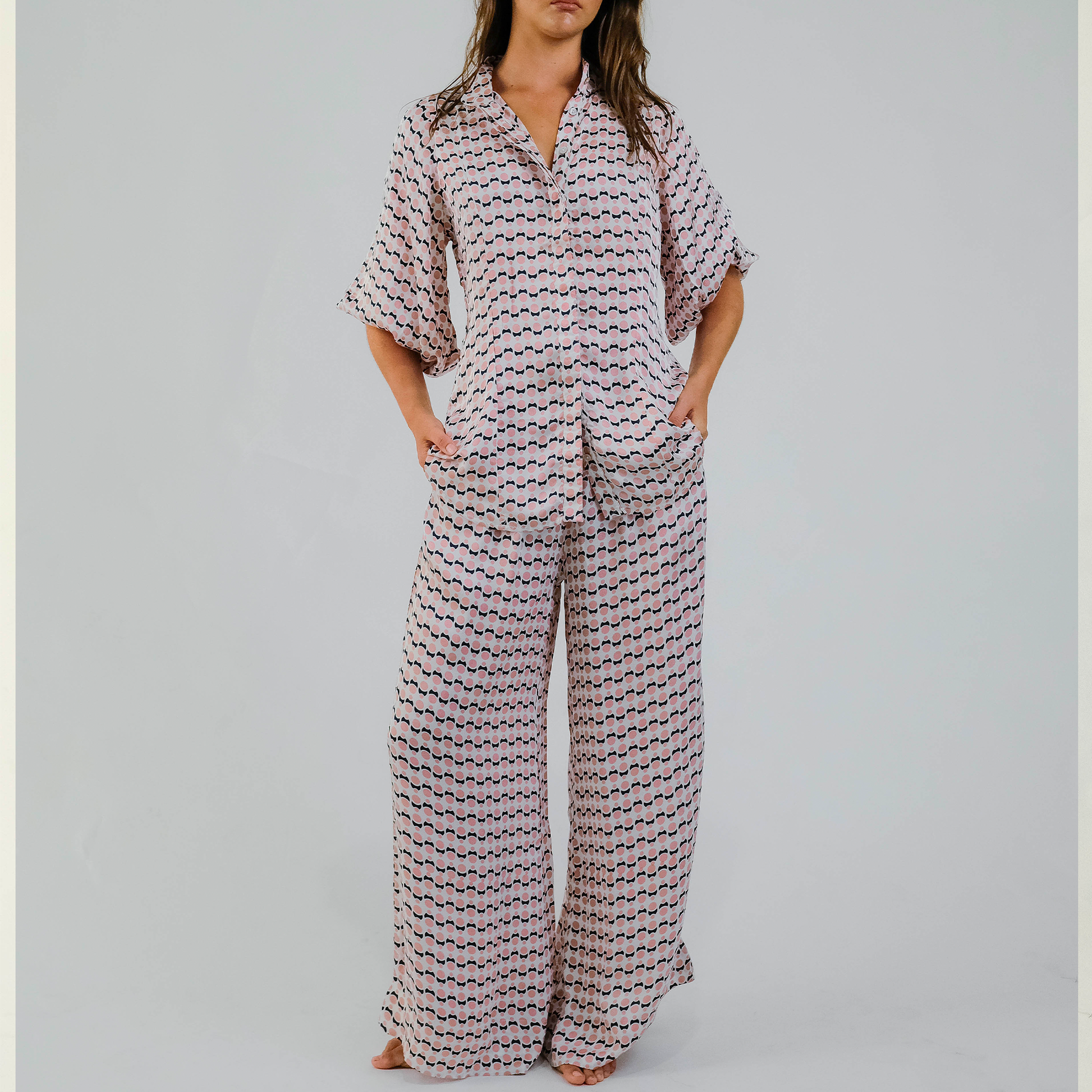 This lightweight modal wide leg pant features Art Deco-inspired patterning and a softly structured drape for effortless wear.