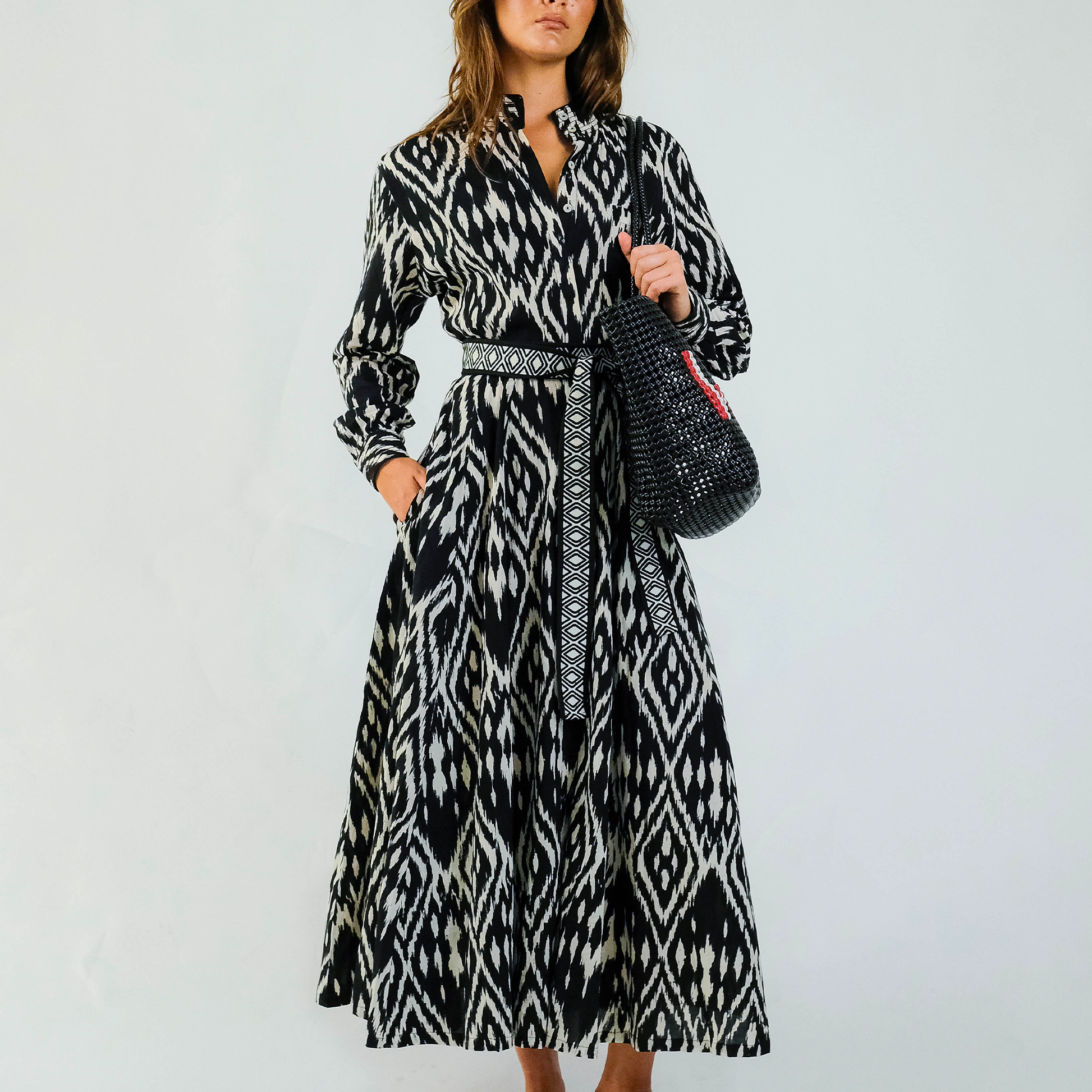Crafted from 100% breathable cotton, it features a striking ikat print and black stitching for a contemporary touch. Mother-of-pearl buttons add a hint of sophistication, while functional pockets make this dress as practical as it is stylish.