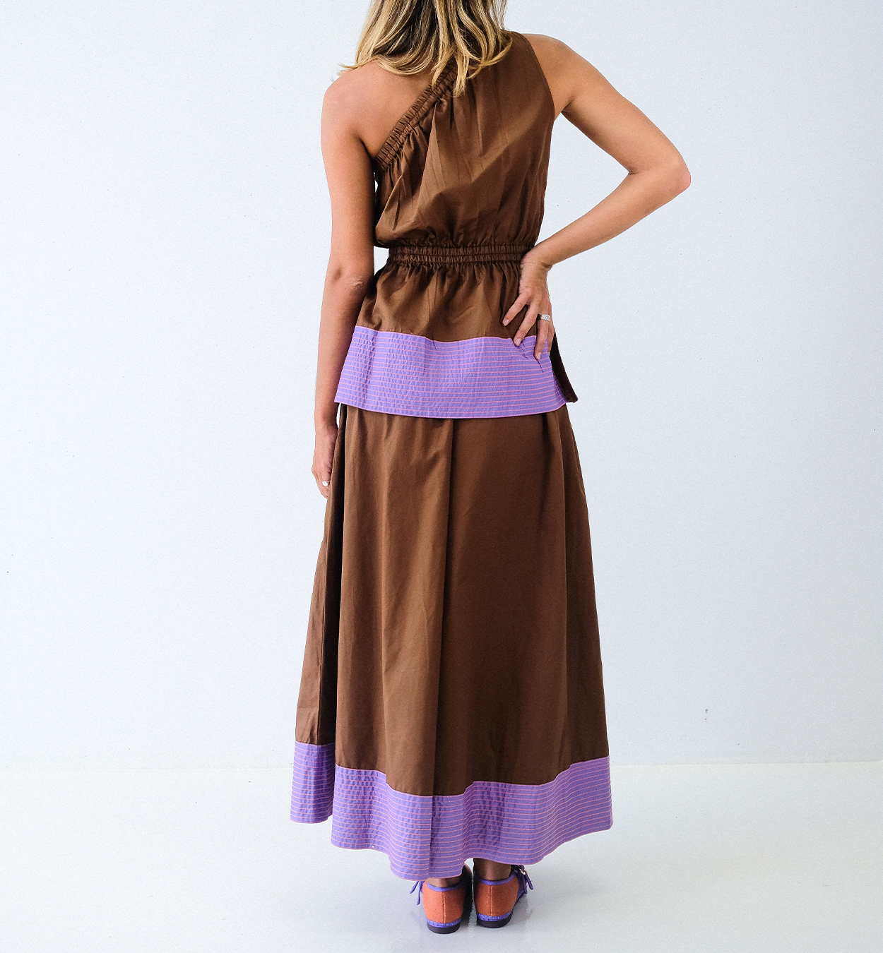 The brown and purple colour block combination is elevated with neon orange contrast stitching on the purple peplum panel, adding a sharp, unexpected detail. Side slits enhance movement and ease, making this an effortless statement piece for warm days, travel and elevated casual styling.