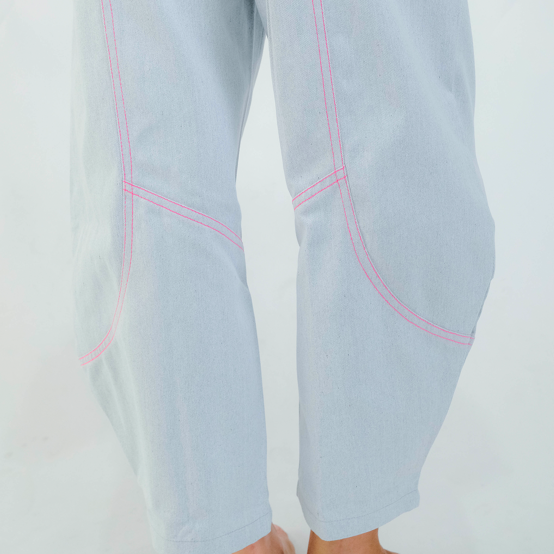 Crafted from cotton denim for all-day comfort, the Barrel Cut Pant features sculptural lines, functional pockets, and a touch of hot pink piping for a pop of personality.