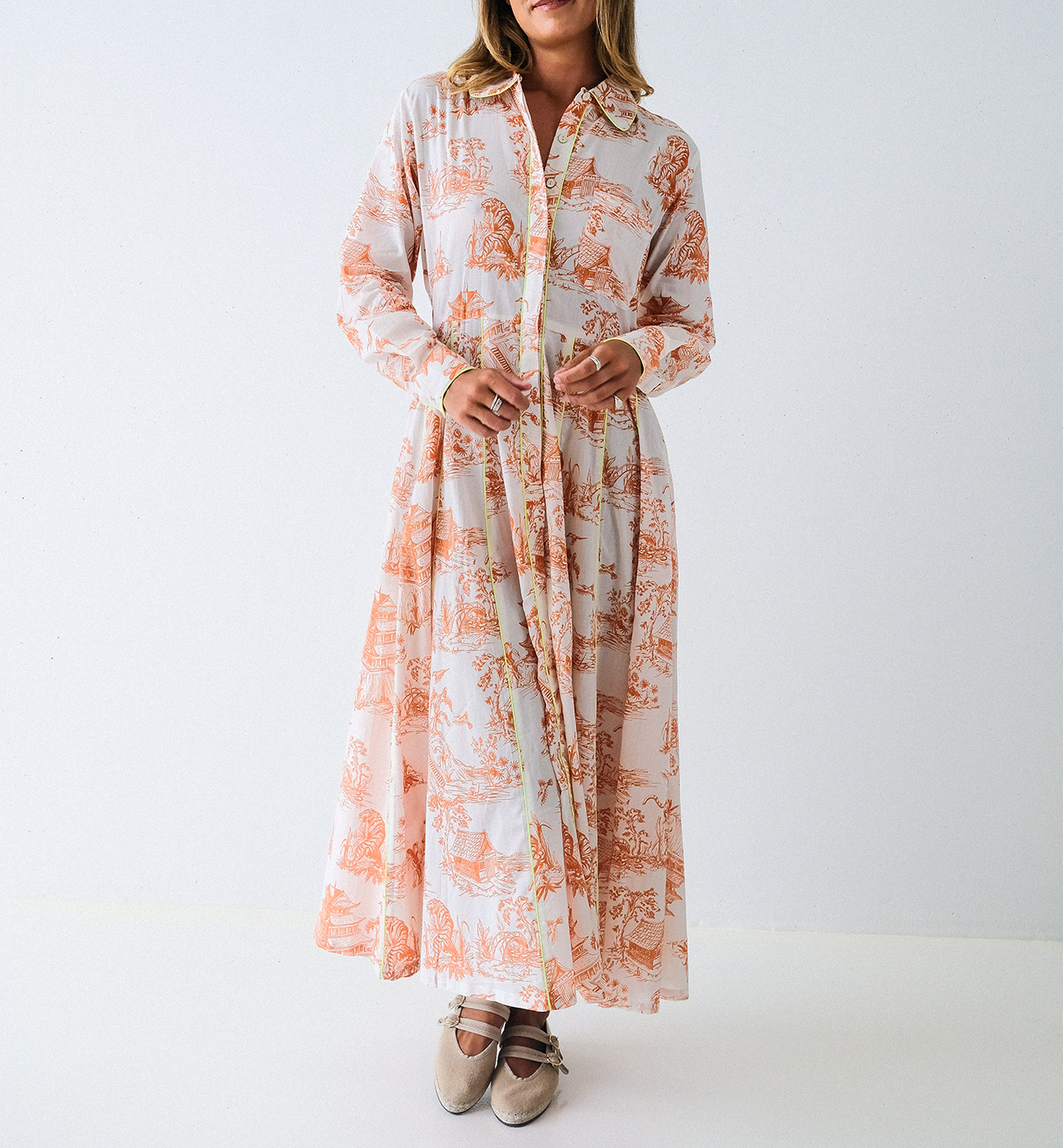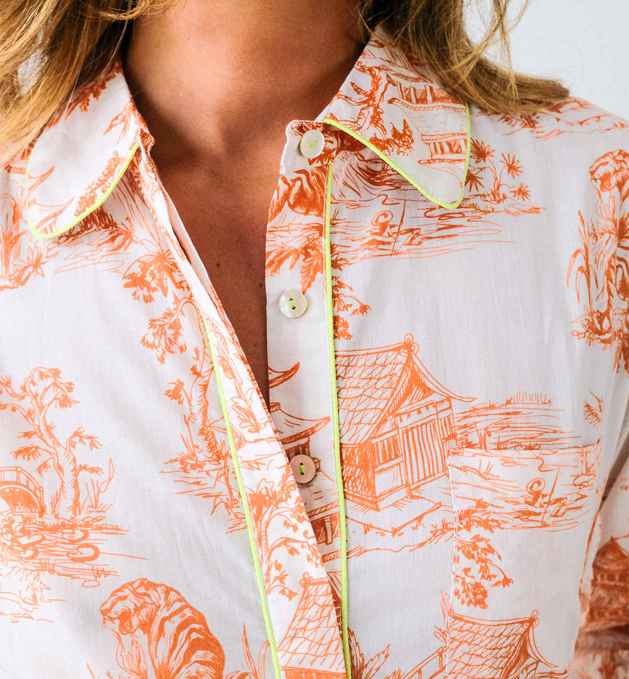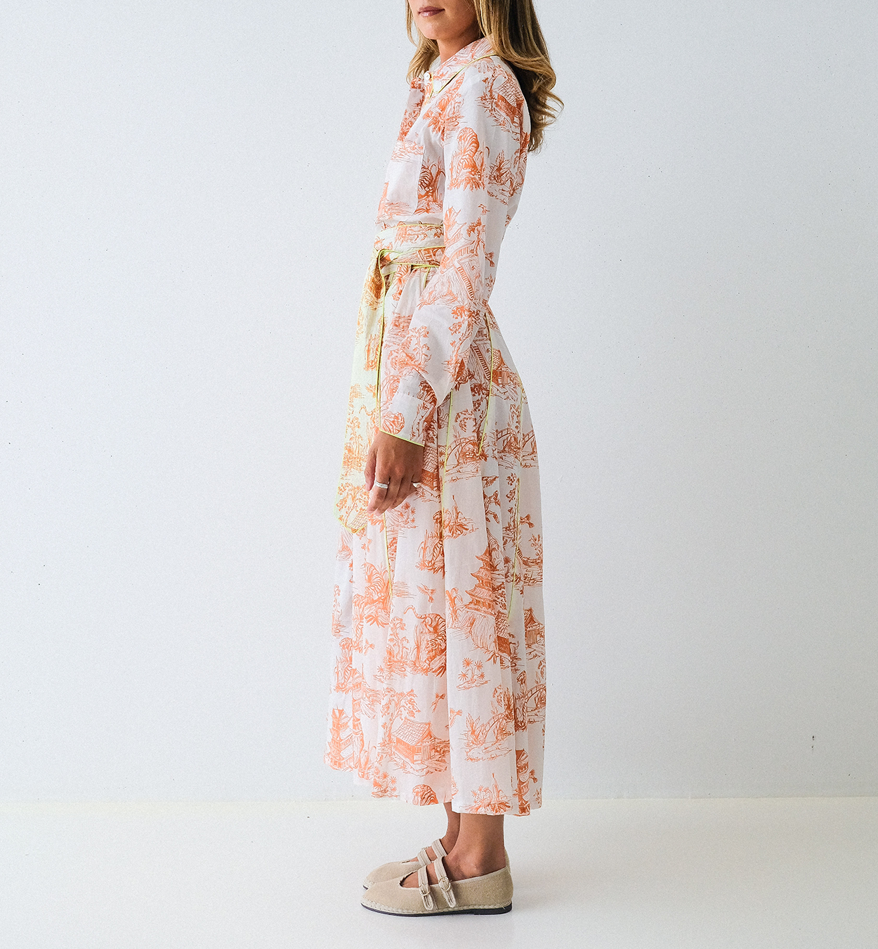 The striking orange chinoiserie print is elevated with acid apple piping, adding a modern, unexpected contrast that highlights the lines of the design. Long sleeves bring balance and versatility, making this piece ideal for transitional dressing, travel and occasions that call for something distinctive yet wearable.