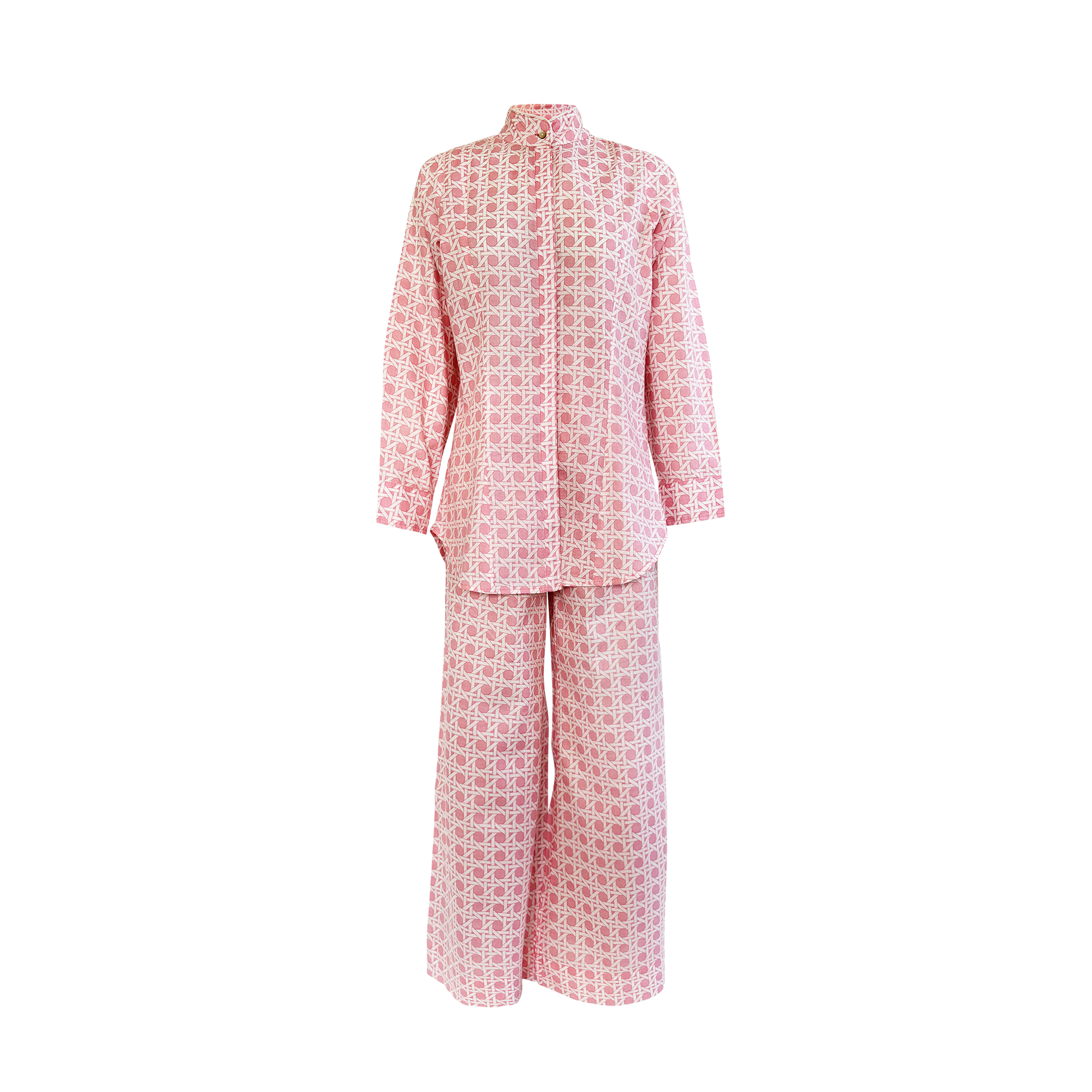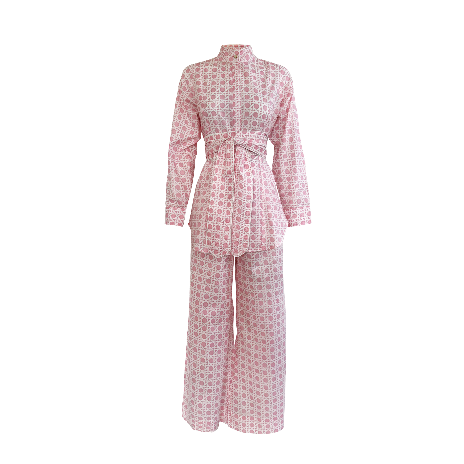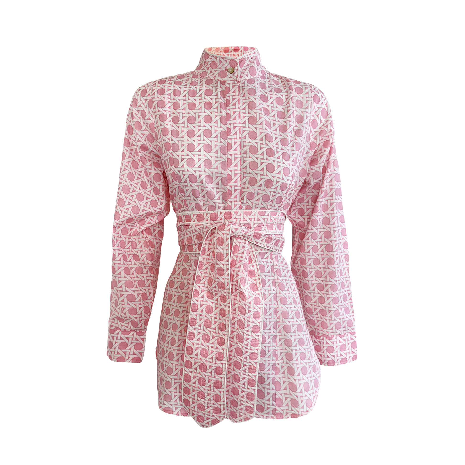 Palm Beach Pink Rattan Print Belted Shirt This pastel pink rattan-print belted shirt is designed for both style and comfort.  Perfect for warm days, brunch dates, or summer events, it's a wardrobe staple you'll reach for again and again. Features: Soft pastel pink rattan pattern print Mother of Pearl buttons Self fabric tie - wear it with or without Style it your way—pair with the Palm Beach Rattan Wide Leg Pant, and dress it up with heels or keep it casual with sandals. 100% Cotton | light weight | machine wash | cold gentle cycle | hang to dry in shade.