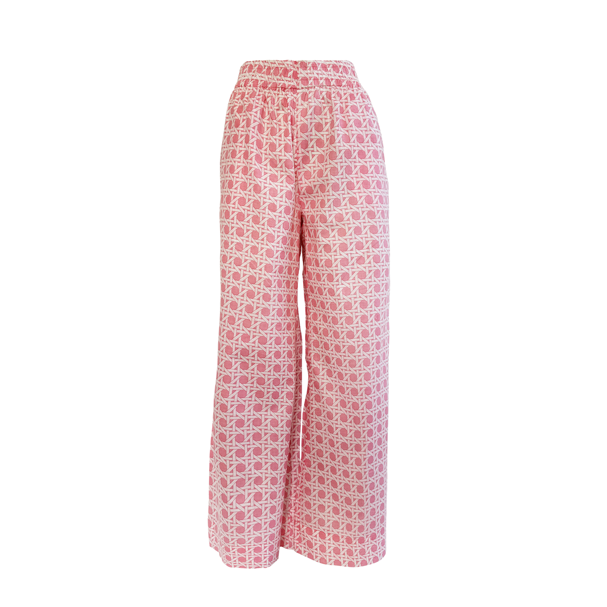 Pastel Pink Rattan Print Wide Leg Pant This pastel pink rattan-print wide leg pant is designed for both style and comfort. Featuring a flattering silhouette, it comes with an elastic waist. Thoughtfully designed with functional pockets, this pant is as practical as it is beautiful. Perfect for warm days, brunch dates, or summer events, it's a wardrobe staple you'll reach for again and again. Features: Soft pastel pink rattan pattern print Flattering panel design for a tailored fit Style it your way—pair it with the Palm Beach Rattan Belted Shirt, and dress it up with heels or keep it casual with sandals. 100% Cotton | light weight | machine wash | cold gentle cycle | hang to dry in shade.